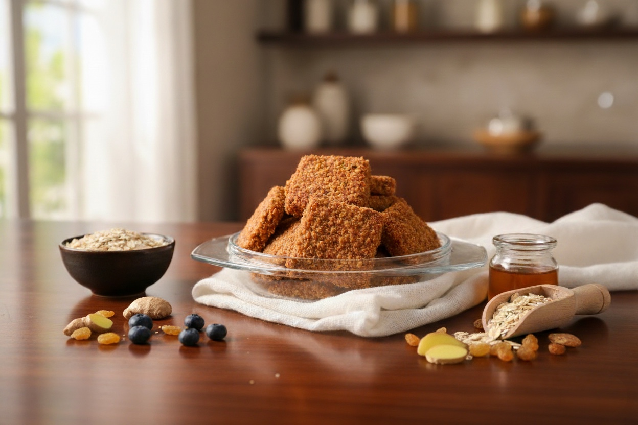 Oats are naturally high in dietary fiber, helping support heart health, digestion, and long-lasting fullness. Ginger is known for its anti-inflammatory and digestive properties, making this combination ideal for those seeking a light yet nourishing snack. Together, oats and ginger create a cookie that feels comforting, balanced, and easy to digest—perfect for mindful snacking.